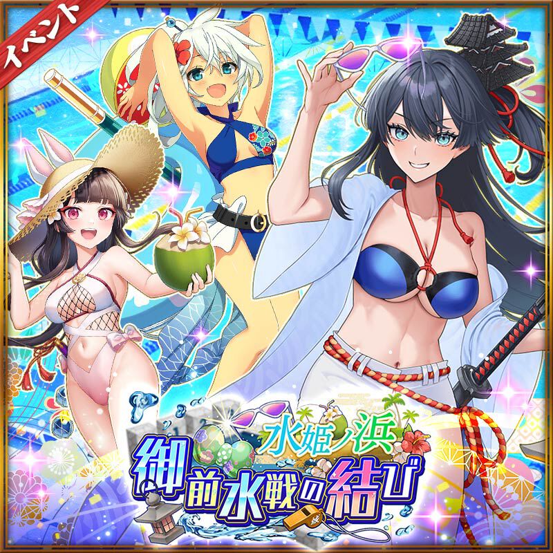 『城姫クエスト 極』では9月17日より、新イベント“水姫ノ浜 御前水戦の結び”がスタートしました。琵琶湖の浮島についに完成した“水姫ノ浜”にて、水の合戦大会が開催。残暑が続くなか、水着城姫たちが激突します!